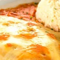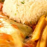 3 pedaços de filé de frango empanado e frito, gratinado no maçarico com muçarela deliciosa e molho de tomate especial. Acompanha: Arroz à grega perfeito.