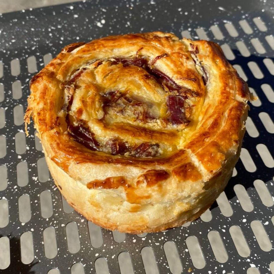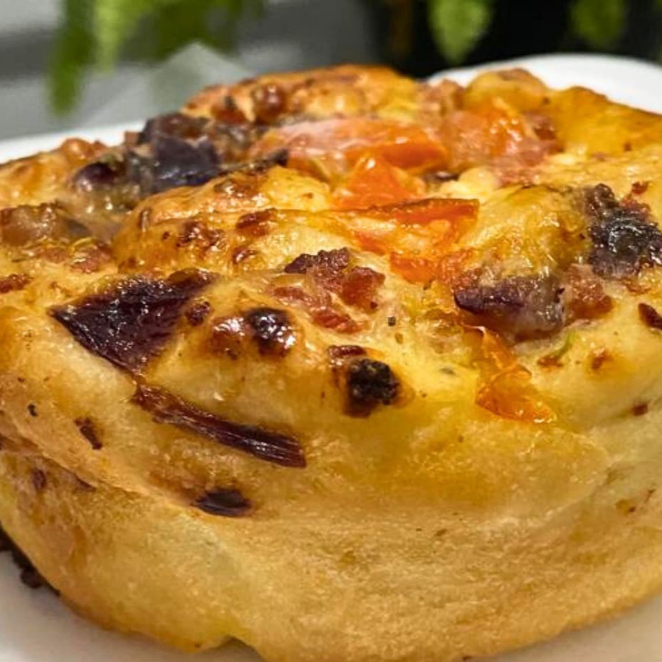 Pão em espiral recheado com calabresa desfiada, cebola roxa caramelizada, requeijão, tomates grapes confitados.