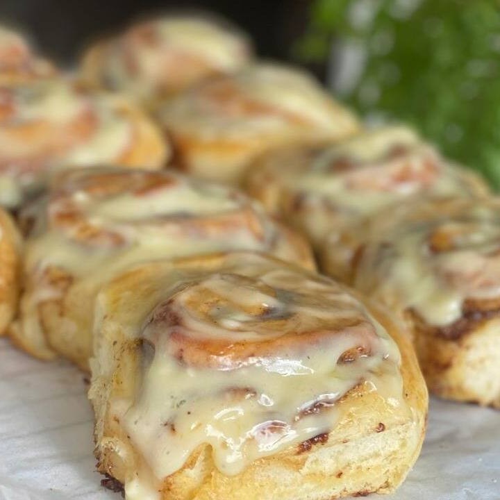 Pão doce em formato espiral com finas camadas de açúcar mascavo e canela coberto com creme de cream cheese e baunilha.