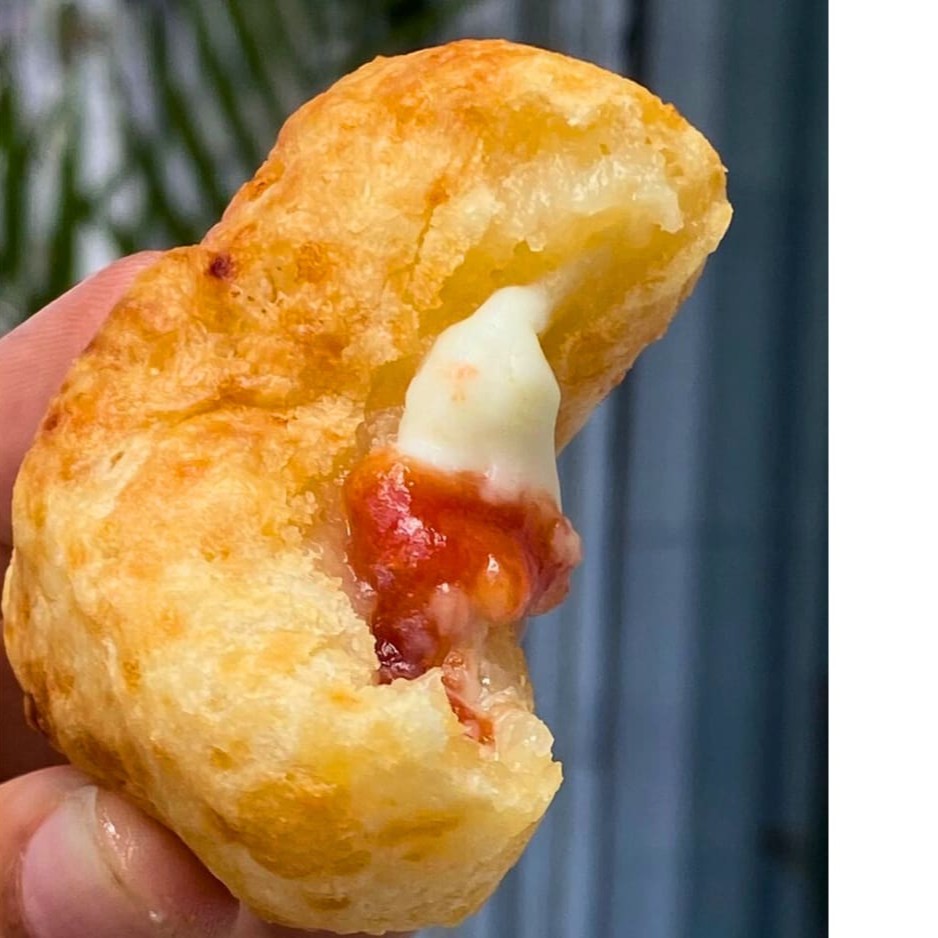 Pão de massa de batata recheado com calabresa temperada e requeijão cremoso.