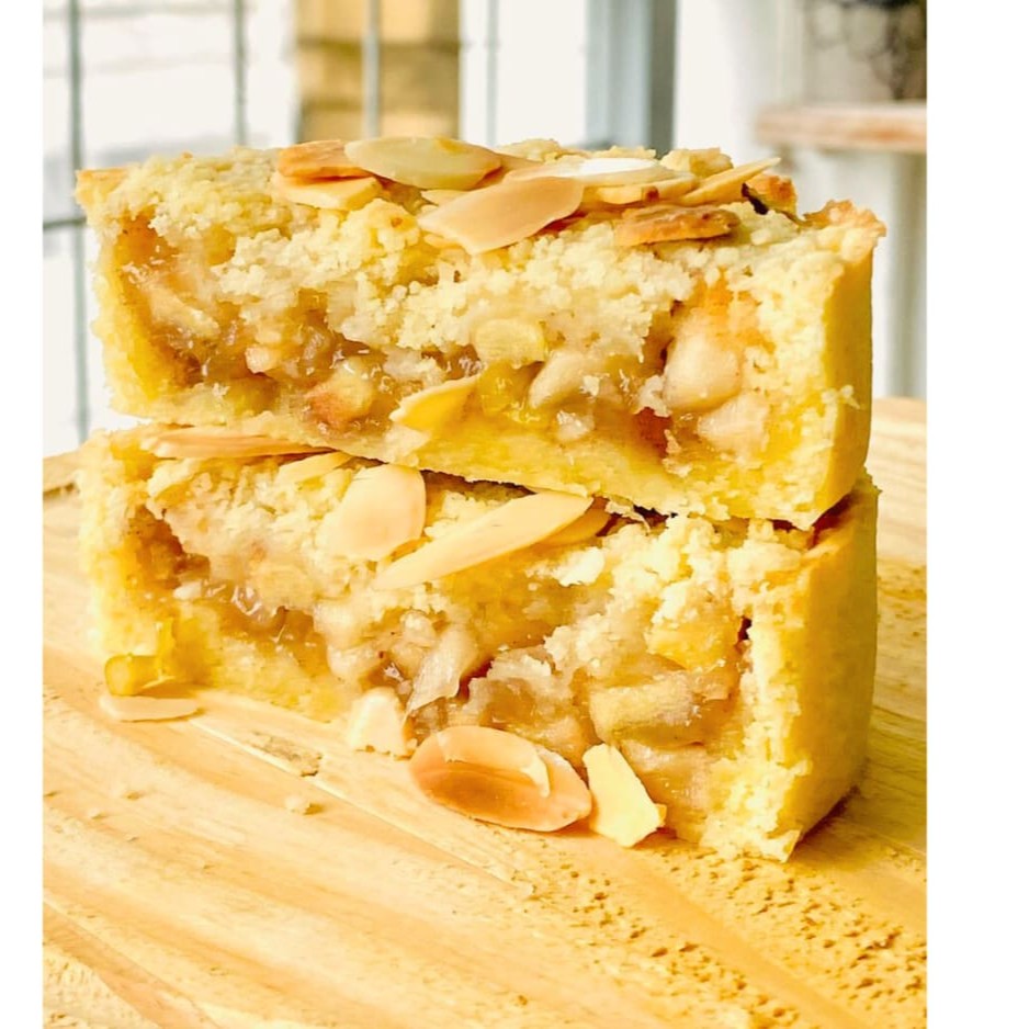 Deliciosa torta quebradiça de especiarias, maçã caramelizada e crocante de amêndoas. Um clássico da confeitaria. Perfeita para comer morninha com aquele cafézinho no final da tarde.