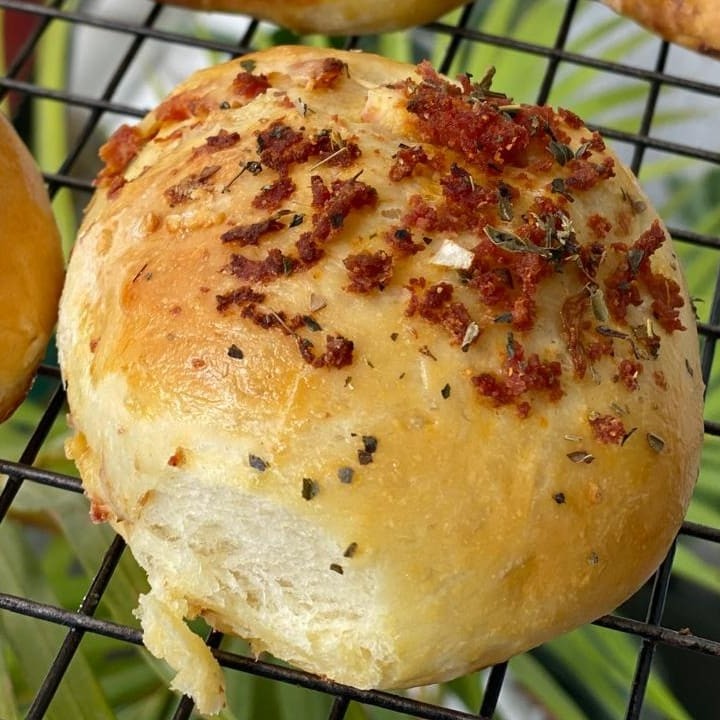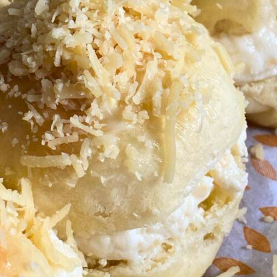 Mini pão delicia de massa extremamente fofinha recheado com creme de queijo parmesão coberto com queijo parmesão ralado.