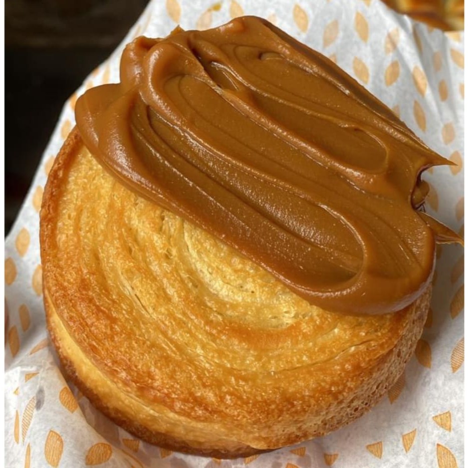 Massa folhada assada em formato espiral recheada com doce de leite cremoso.