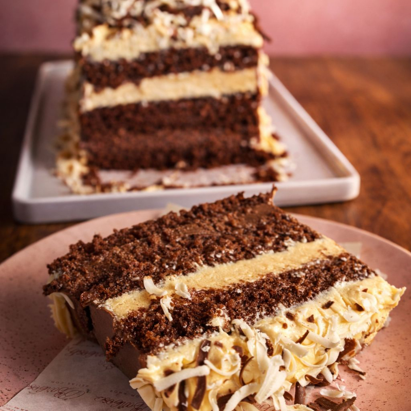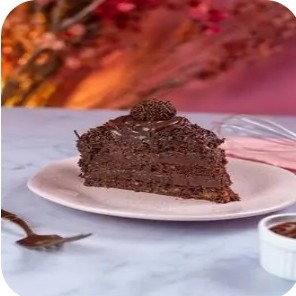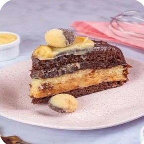 Generosa fatia de uma torta de chocolate com massa de pão de ló bem molhadinha e recheada com duas camadas de chocolate ao leite. 200g.