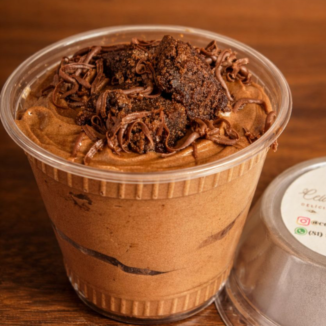 Delicioso copo da felicidade com mousse de chocolate e lascas de brownie. 250ml.