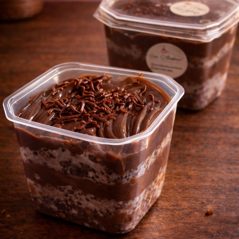 Delicioso bolo no pote de chocolate ao leite bem molhadinho. 220ml