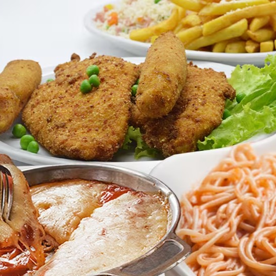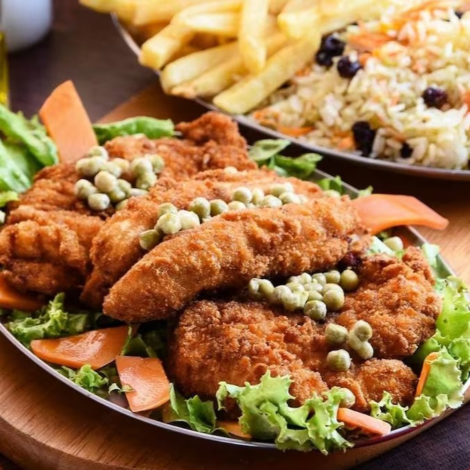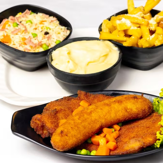 - Frango à milanesa, banana à milanesa, arroz à grega e batata frita