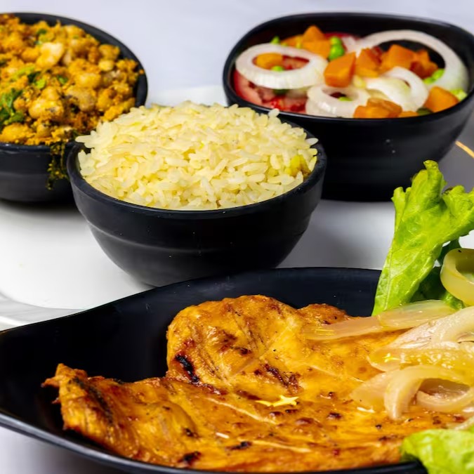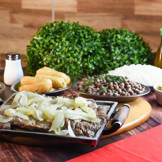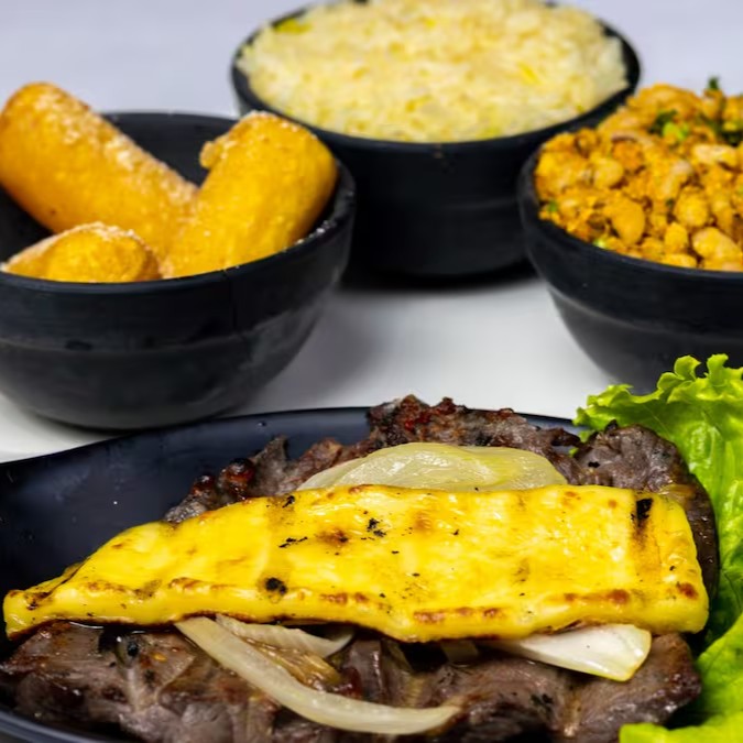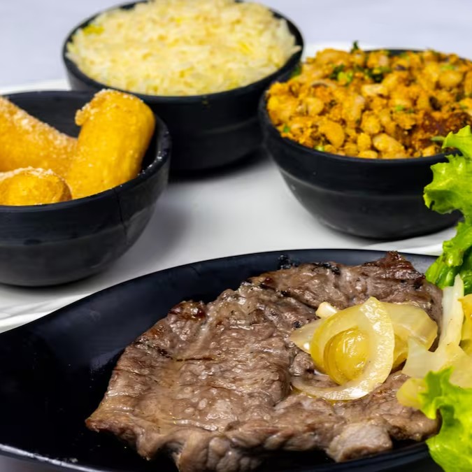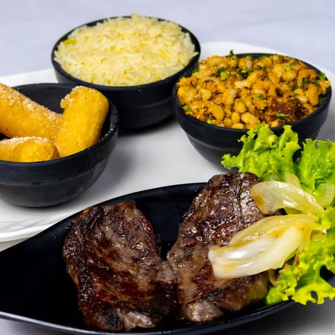 Carne de sol grelhada na chapa, feijão tropeiro, arroz refogado, farofa, vinagrete, fritas.