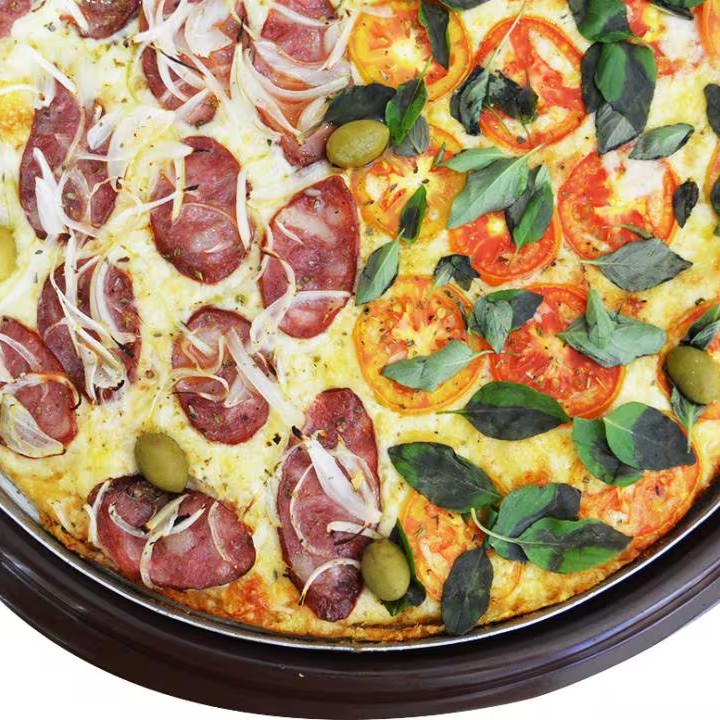 Maguerita com manjericão, frango, napolitana, banana, calabresa, mussarela, marguerita da casa