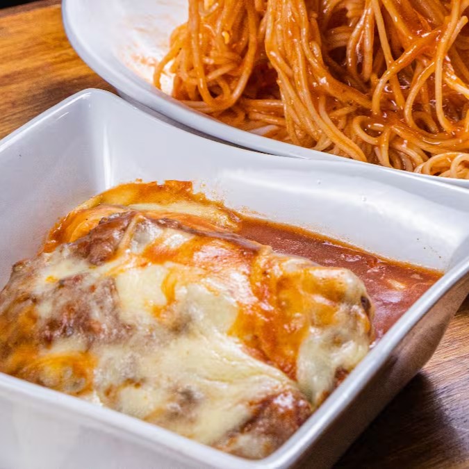 Filé empanado ao molho de tomate, gratinado com muçarela, acompanha espaguete ao molho de tomate e queijo ralado.