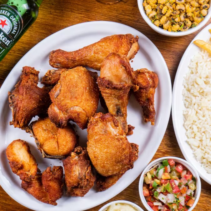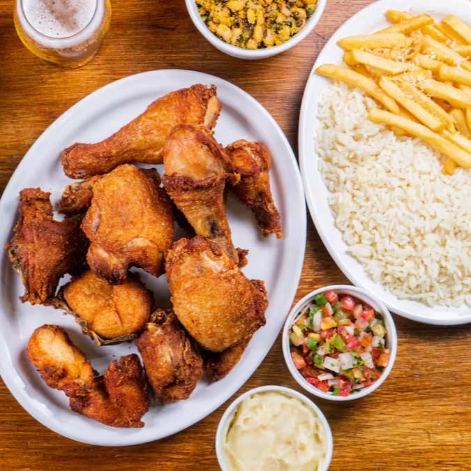 - Frango frito, acompanhado de arroz branco, feijão tropeiro, farofa, vinagrete e batata.