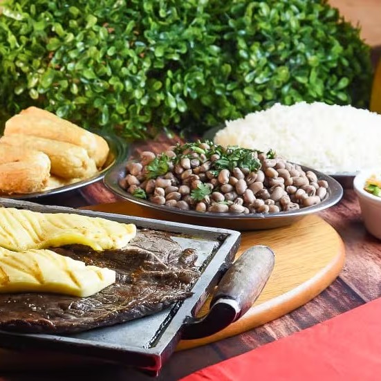 - Maminha na brasa acompanhado de arroz, feijão tropeiro, farofa, vinagrete e macaxeira frita