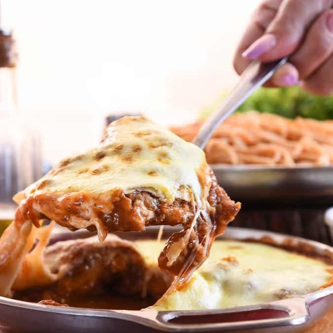 Massa de Spaghetti, ovos cozidos, molho bolonhesa, gratinado com mussarela.
