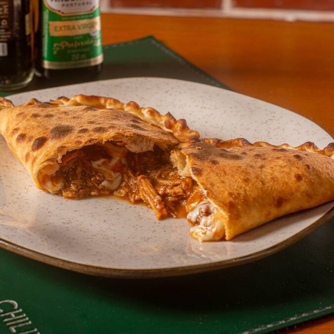 Calzone recheado com costelinha suína ao barbecue e queijo mussarela.