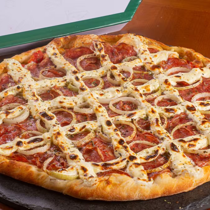 Repleta de calabresa,molho de tomate artesanal, queijo mussarela argentino, cream cheese, cebola e toque de orégano.