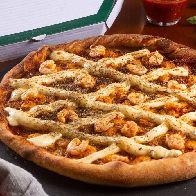 Molho de tomate artesanal, queijo mussarella argentino, filé de camarão refogado ao azeite (por dentro e por cima da pizza), queijo Catupiry ou cream cheese, e orégano.