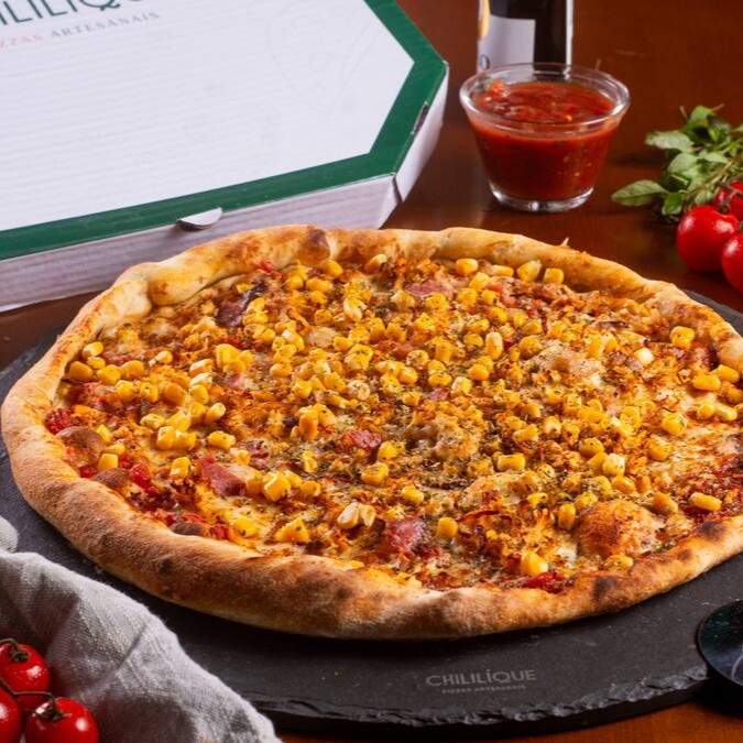 Molho de tomate artesanal, queijo mussarella argentino, frango temperado desfiado, bacon, milho verde toque de orégano.