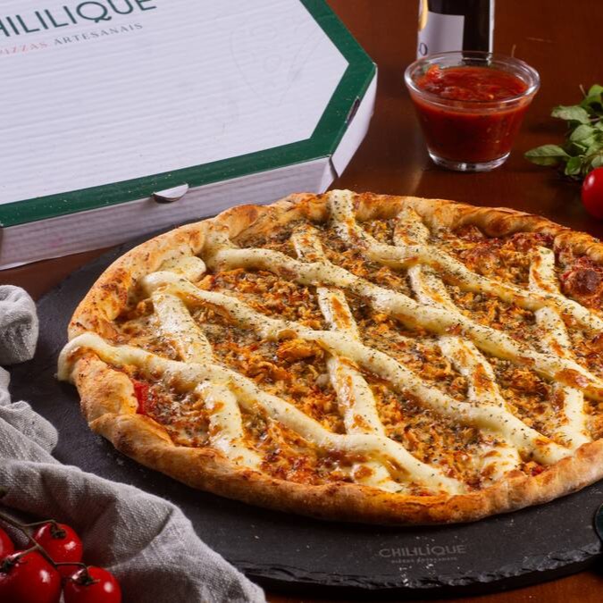 Molho de tomate artesanal, queijo mussarella argentino, frango desfiado, queijo Catupiry Original.