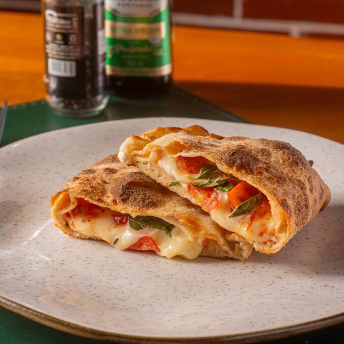 Calzone de margherita, com mussarela, tomate cereja, manjericão, molho de tomate artesanal.