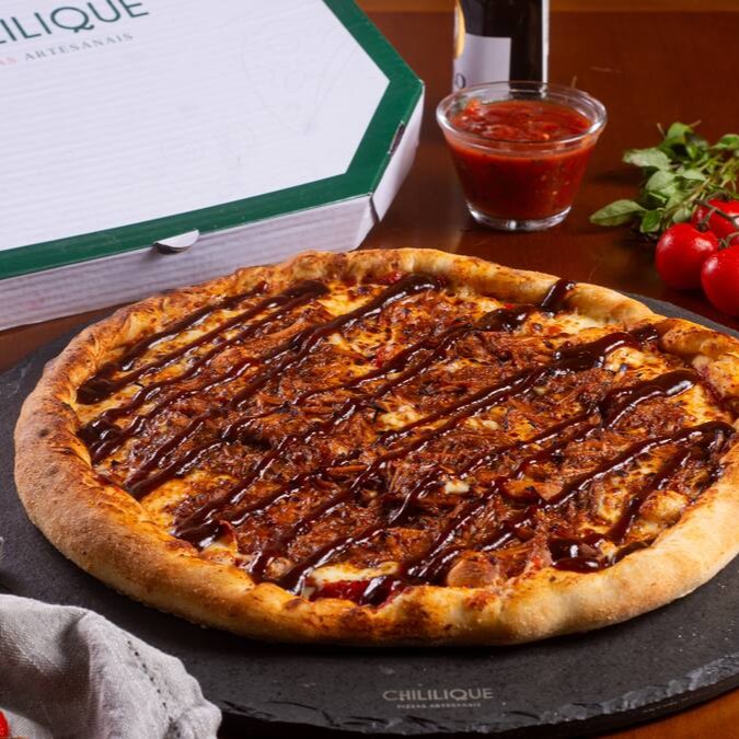 Uma das mais vendidas, é a de costelinha. Molho de tomate artesanal, queijo mussarella argentino, costelinha suína ao molho barbecue e barbecue para finalizar.