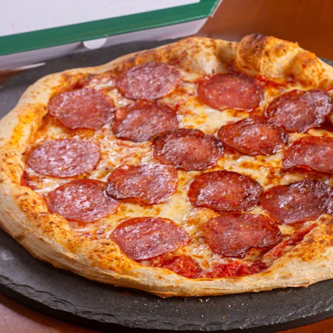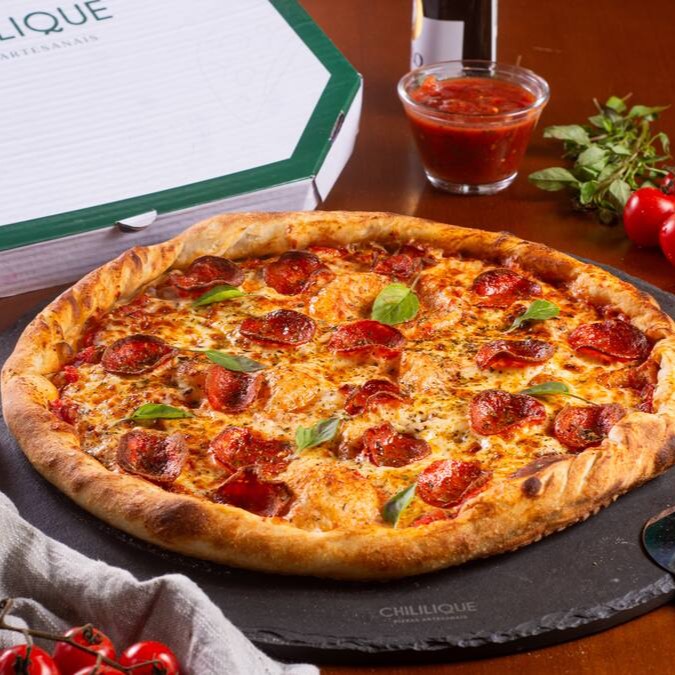 Massa italiana, molho de tomate artesanal, queijo mussarella, salame italiano, e um leve toque de pimenta do reino.