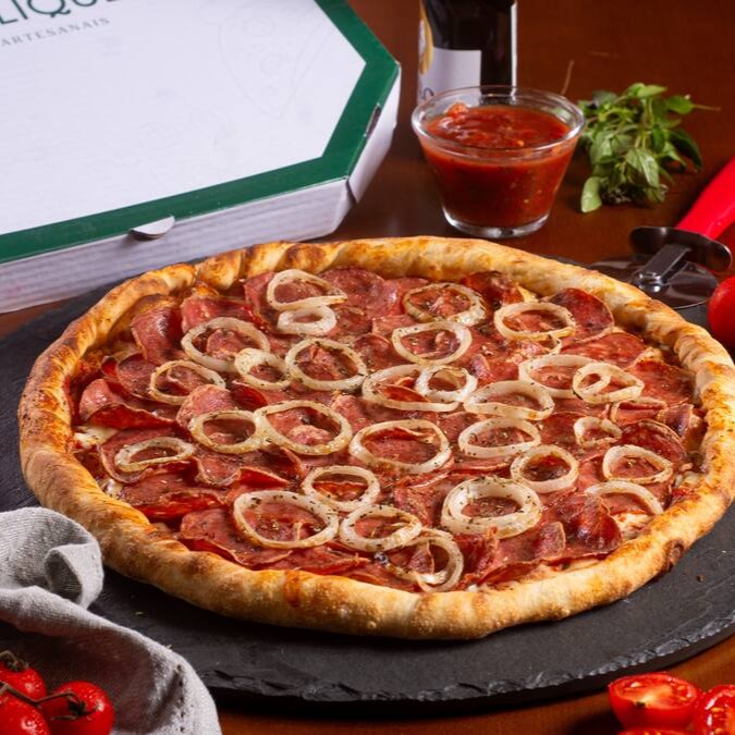 Exatamente como na foto, essa pizza é repleta de calabresa, molho de tomate artesanal, queijo mussarela argentino, cebola e toque de orégano.