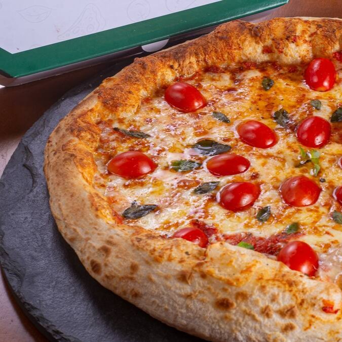 Massa italiana, molho de tomate artesanal, queijo mussarella, manjericão, tomate cereja e orégano.