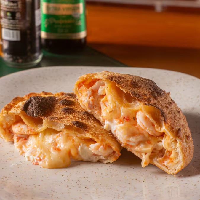 Calzone recheado com camarão, cream cheese e queijo mussarela.