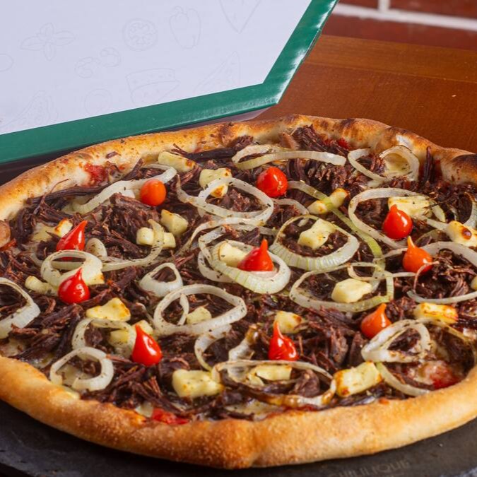 Molho de tomate artesanal, queijo mussarella argentino, cupim de charque desfiado refogado, cebola, orégano e pimenta biquinho.