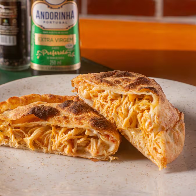 Calzone recheado com frango desfiado, requeijão e queijo mussarela.