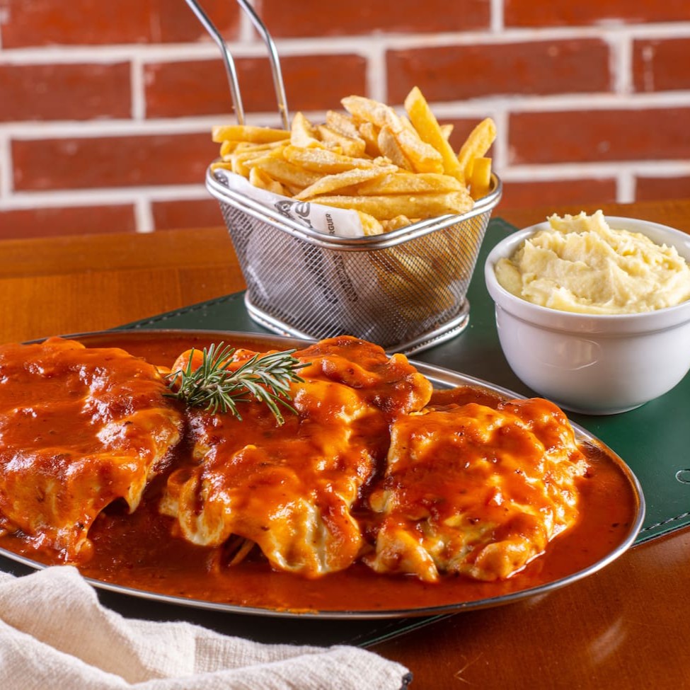 Frango empanado, acompanhado de queijo mussarela, espaguete, molho exclusivo da casa, purê de batata, e batata frita.