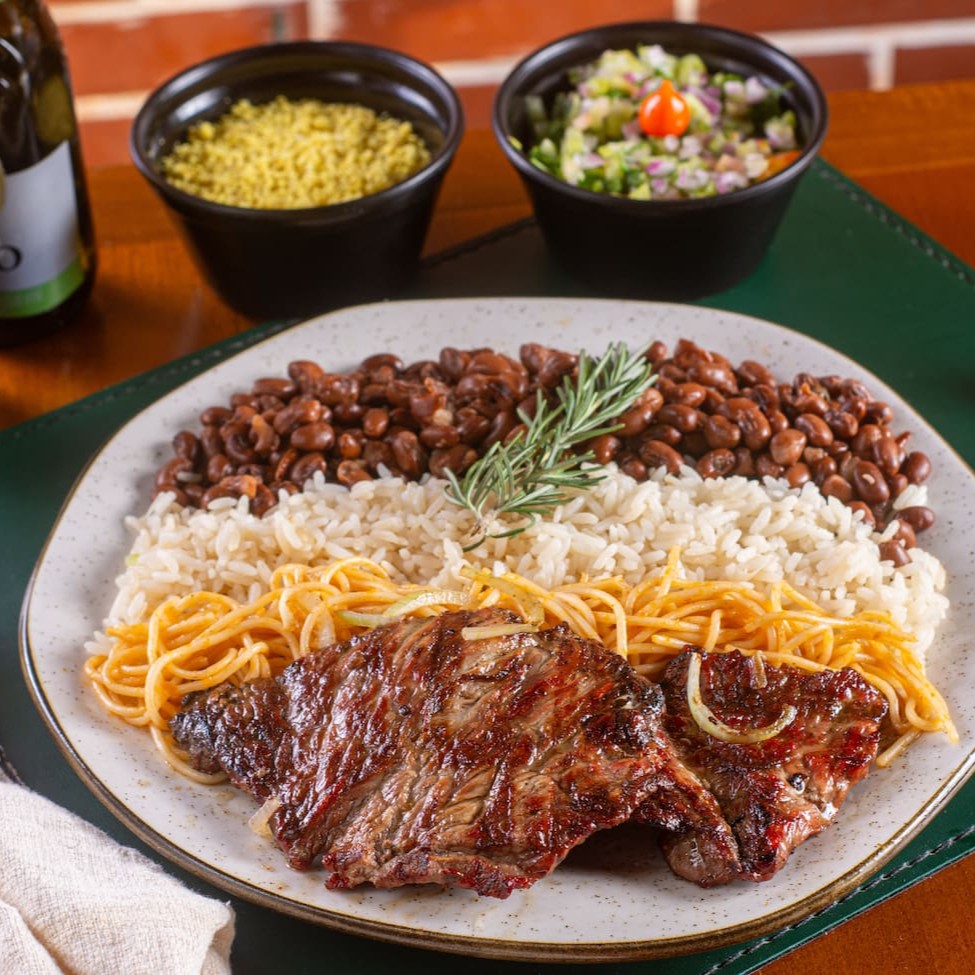 Maminha feita na chapa, não leva óleo, acompanhada de arroz refogado e ou macarrão, feijão à sua escolha, vinagrete e farofinha acebolada.