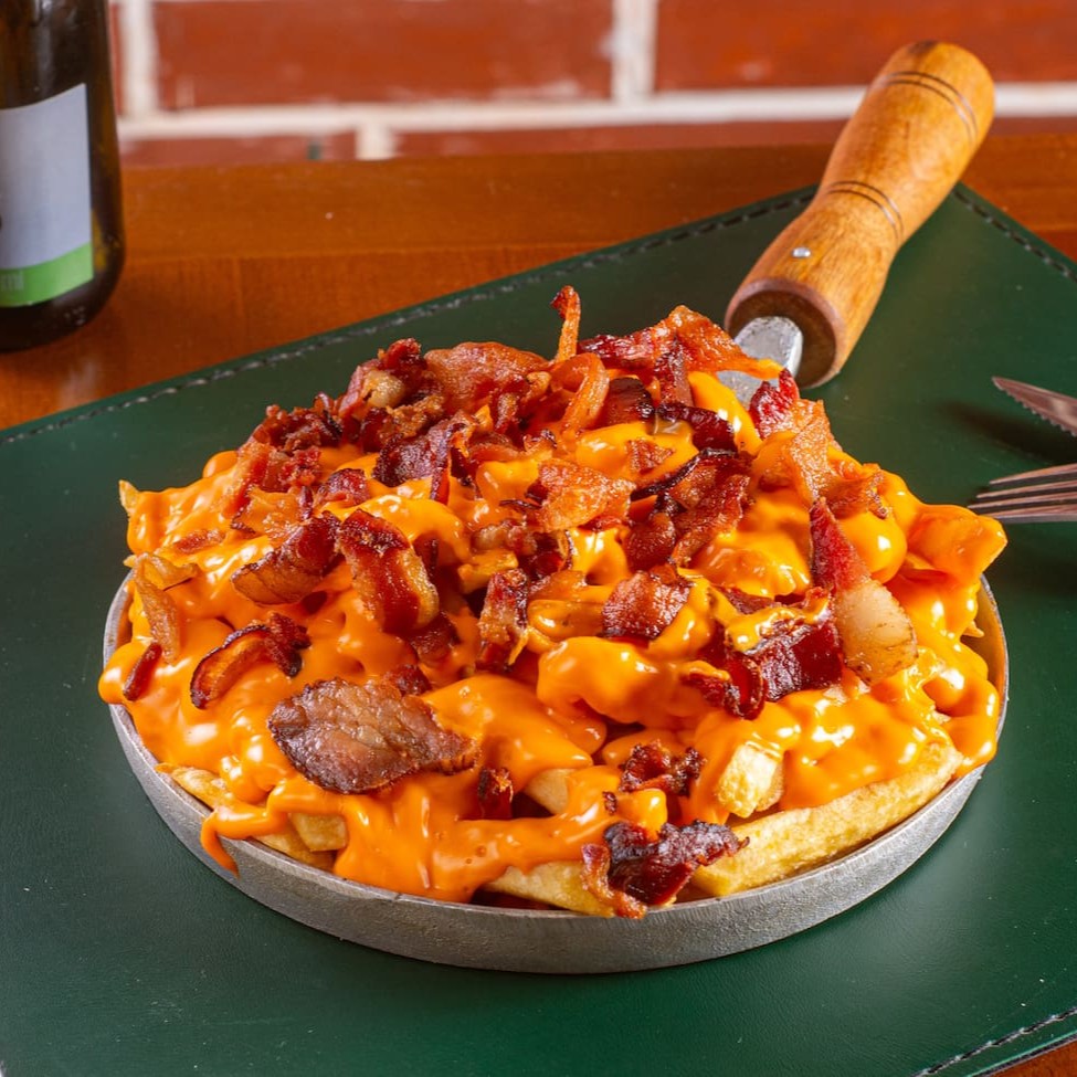 Batata Frita recheada com queijo cheddar, bacon e cebolinho.