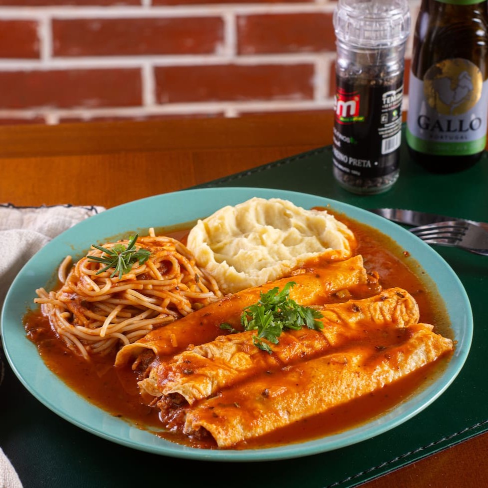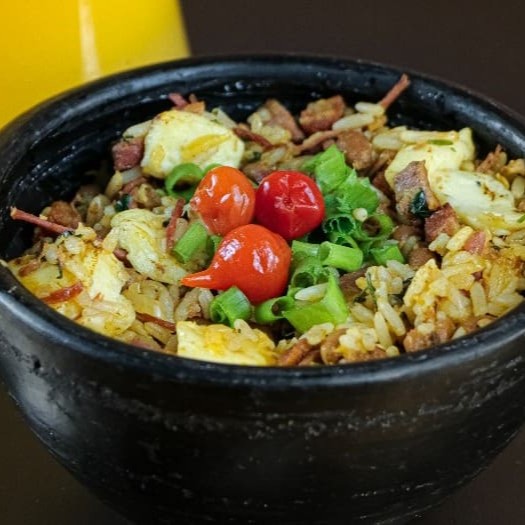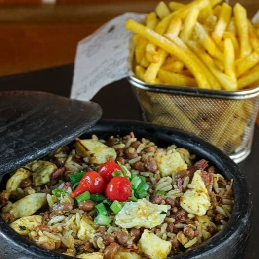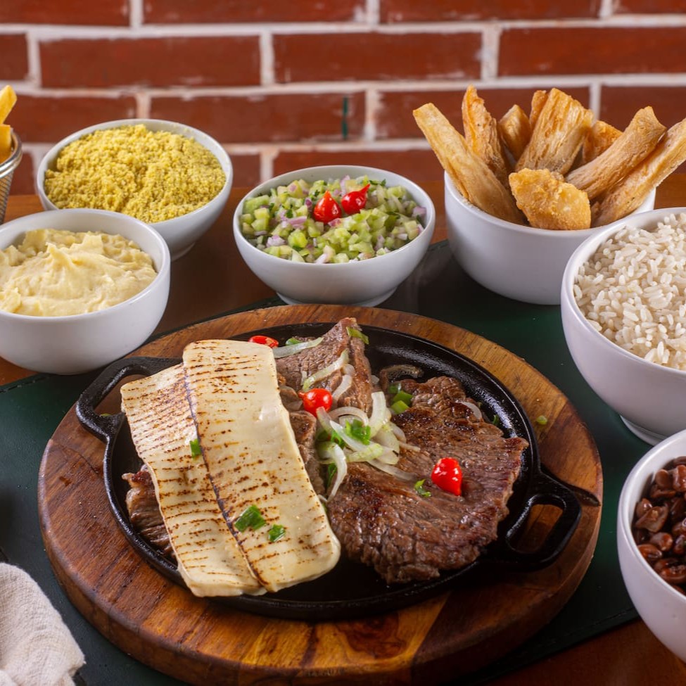 Poucos restaurantes possuem esta opção, mas nós aqui amamos um bom baião, e fizemos questão de incluir no nosso cardápio. Vale a pena, pois é uma excelente opção. Arroz soltinho, feijão de corda, misturados com queijo coalho assado, charque desfiada, calabresa, bacon, paio e temperos caseiros.