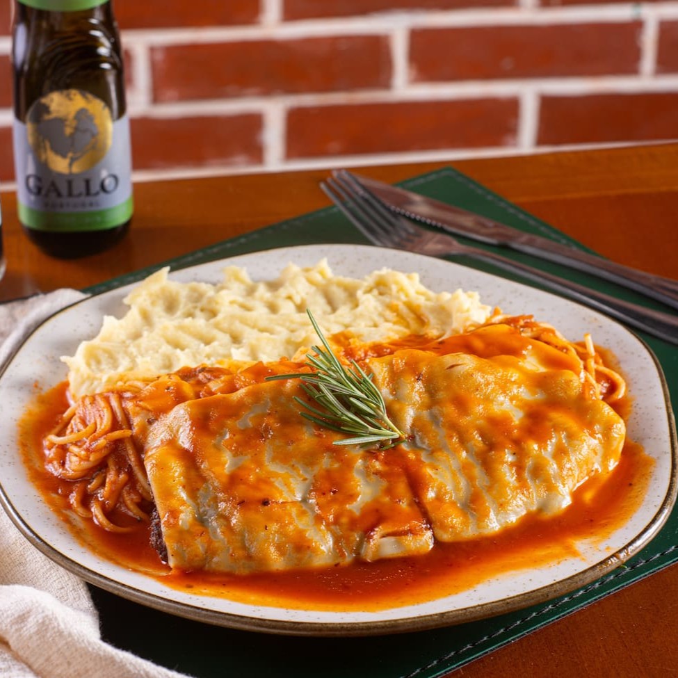 Frango empanado, queijo mussarela, espaguete, molho exclusivo da casa, queijo ralado e purê de batatas