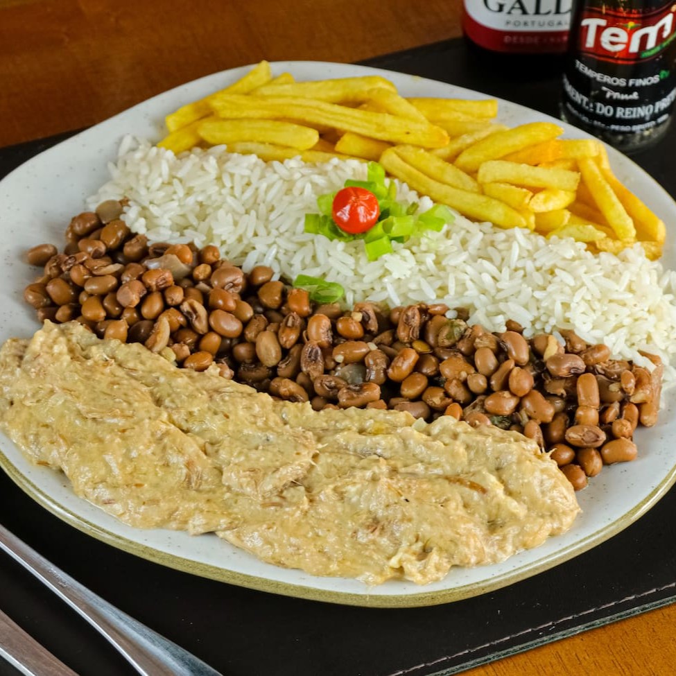 Carne de sol desfiada feita com a nata do leite, acompanhada de feijão de corda, arroz e batata frita.