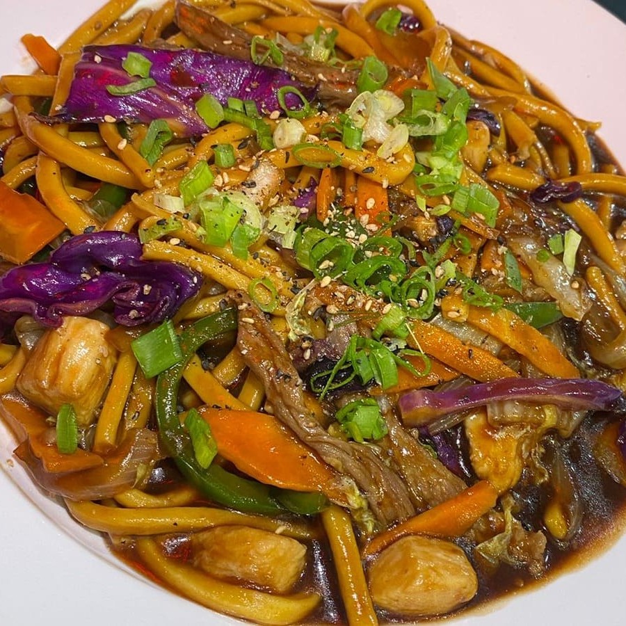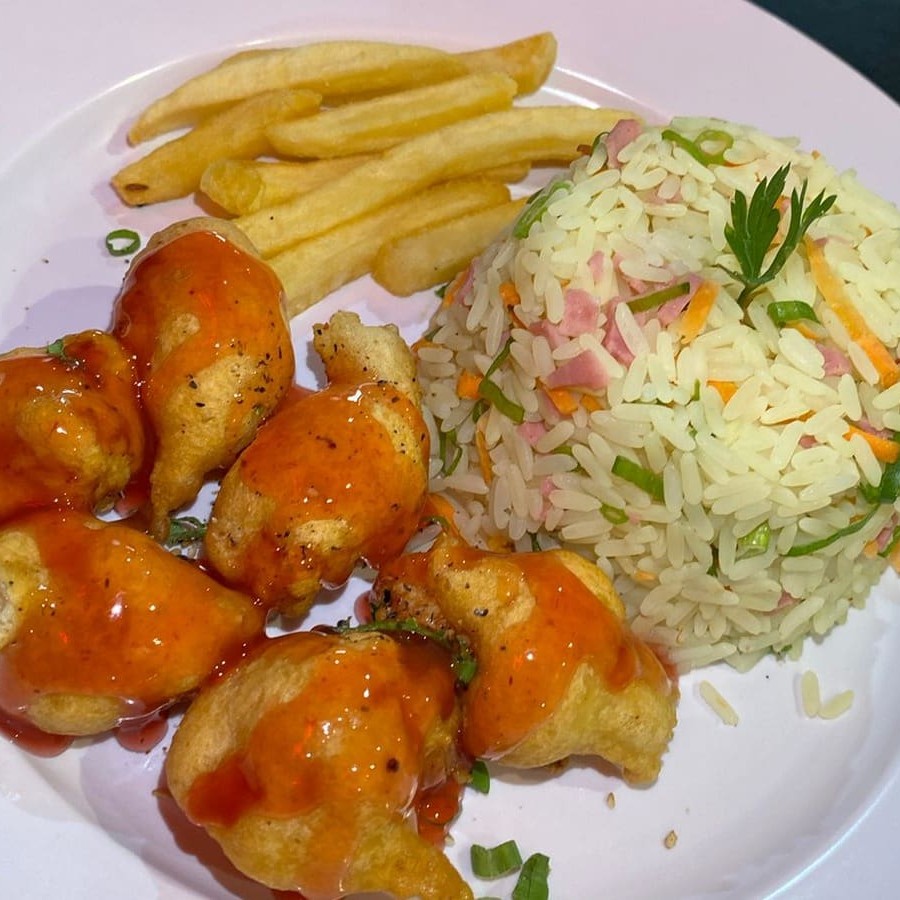 Deliciosos frangos empanados cobertos com nosso irresistível molho agridoce, servidos com arroz chop suey e fritas. Uma combinação perfeita de sabores para seu paladar!
