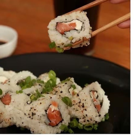 Alga nori empanada e crocante com recheio de arroz, cream cheese e tiras de salmão com um toque especial do chef, acompanha cebolinho!