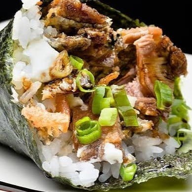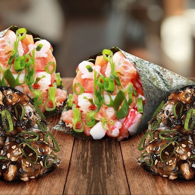 Enrolado em alga em forma de cone recheado de arroz, cubos de kani, cream cheese e cebolinha.