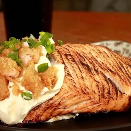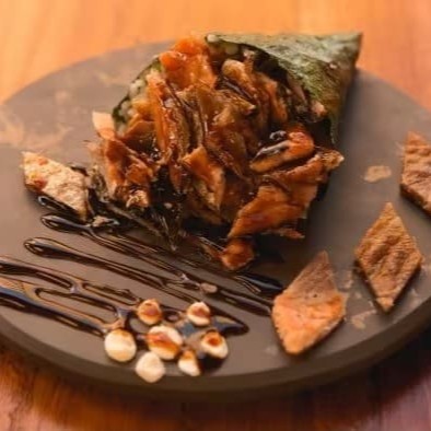Deliciosa manta de Salmão recheada com recheio de arroz, cream cheese e um mix de skin (temperada pelo chef),camarões crocantes e um toque de cebolinho.