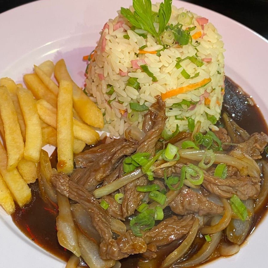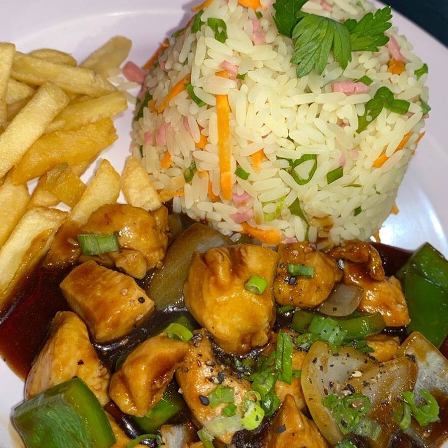 Suculenta carne acebolada, perfeitamente temperada, servida com o delicioso arroz chop suey e batatas fritas crocantes. Uma explosão de sabores em um prato irresistível!