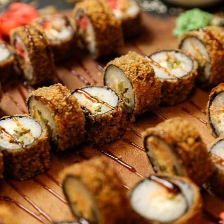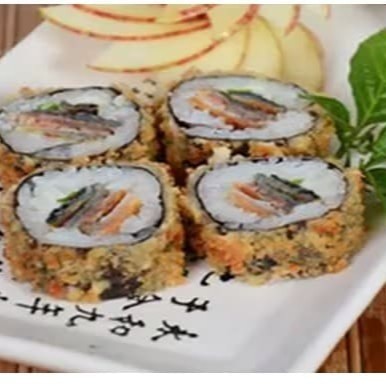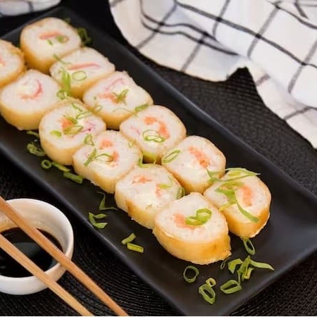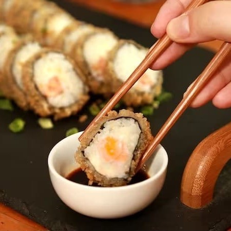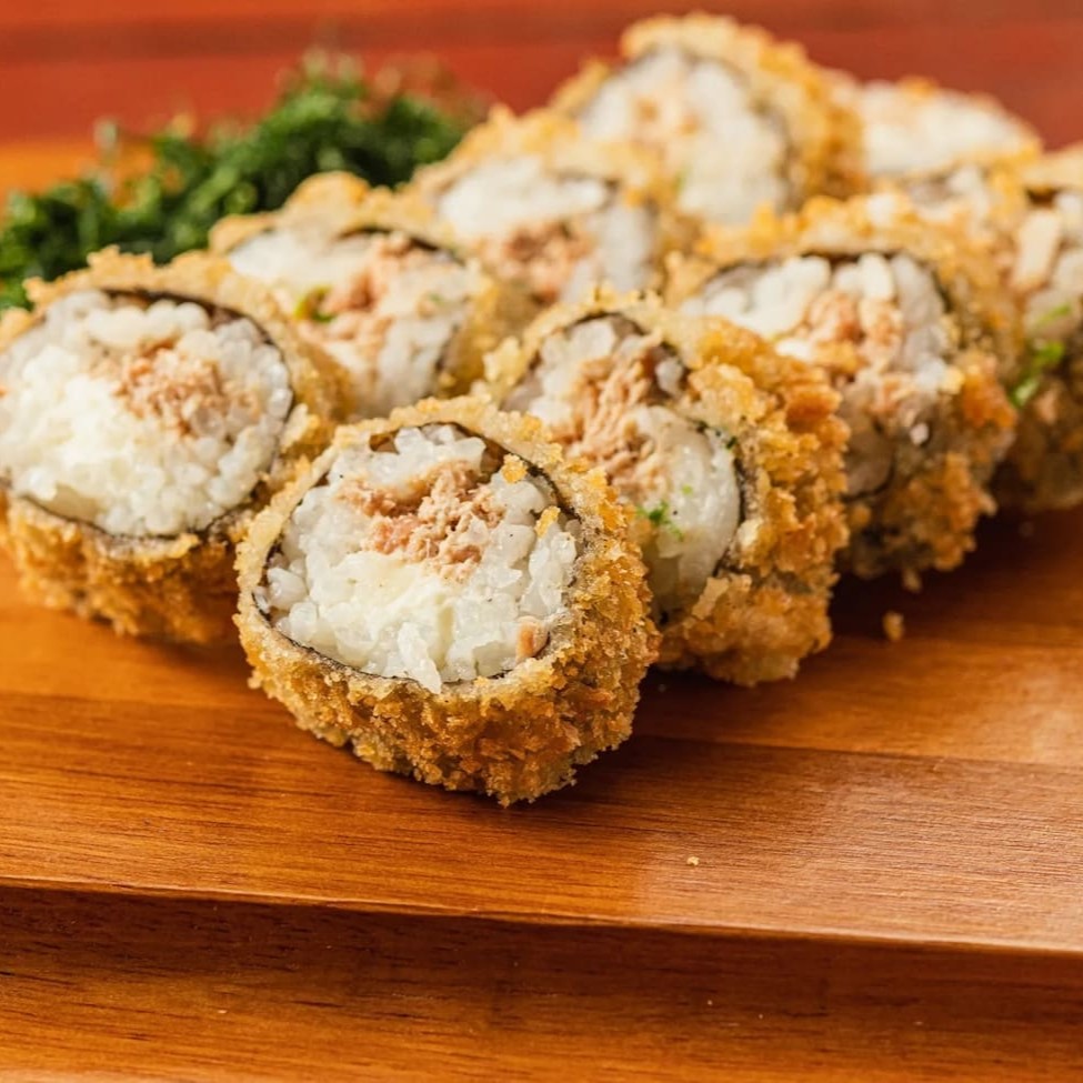 Alga nori empanada e crocante com recheio de arroz, cream cheese e deliciosos cubos de Kani Kama, acompanha cebolinho!