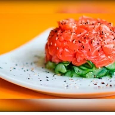 Salada de pepino, cubos de salmão, cobertos de gergelim.