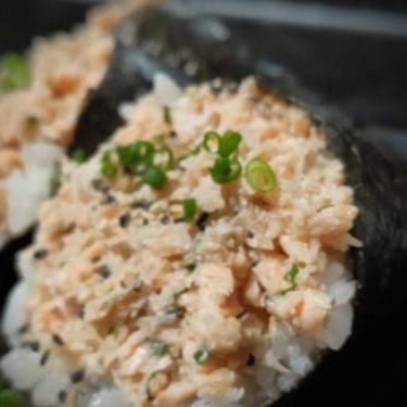 Enrolado em alga em forma de cone recheado de arroz, cubos de salmão fresco, cream cheese e cebolinha.
