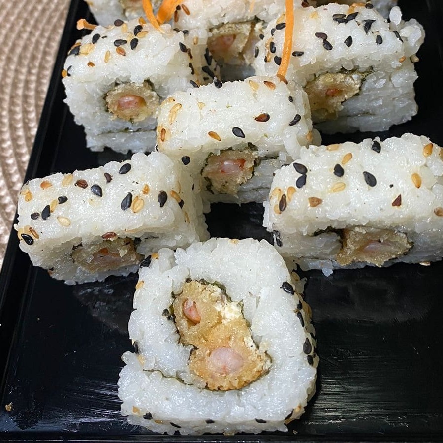 Arroz enrolado na alga nori com recheio de camarão crocante e cream cheese. 12 unidades.
