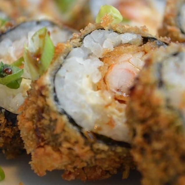 Alga nori empanada e crocante com recheio de arroz, cream cheese e deliciosos camarões crocantes, acompanha cebolinho!