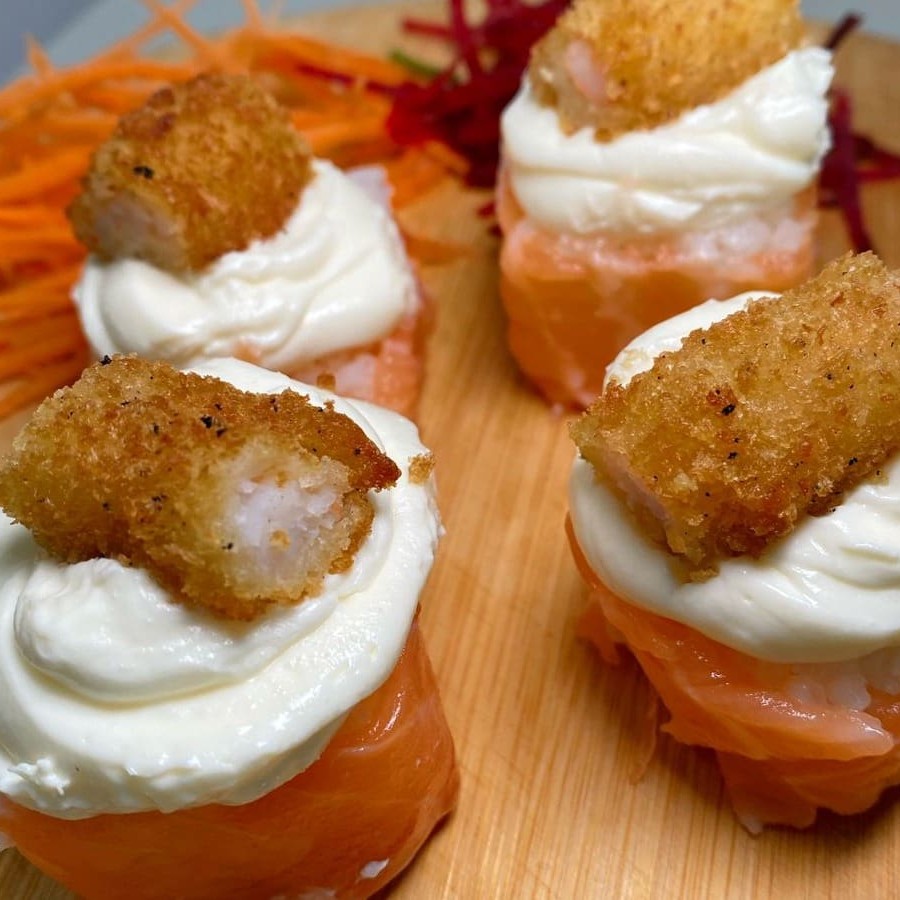 Bola de arroz enrolado com uma lâmina de salmão, cream cheese e recheado por cima com camarão crocante.
