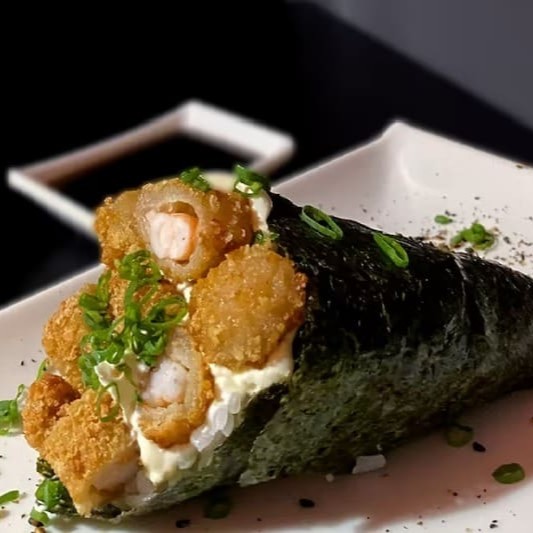 Enrolado em alga em forma de cone recheado de arroz, camarão crocante, cream cheese e cebolinha.