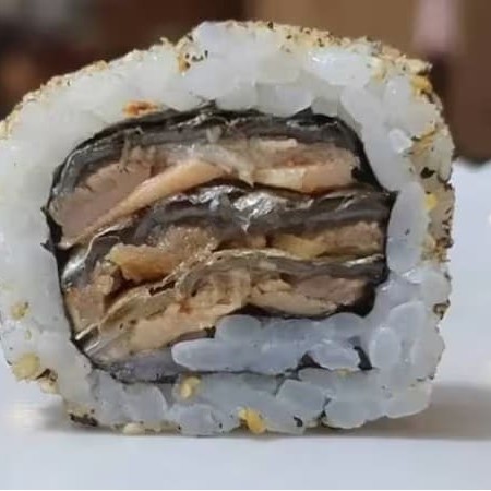 Arroz enrolado por dentro do nori com recheio de pele de salmão empanada. 12 Unidades