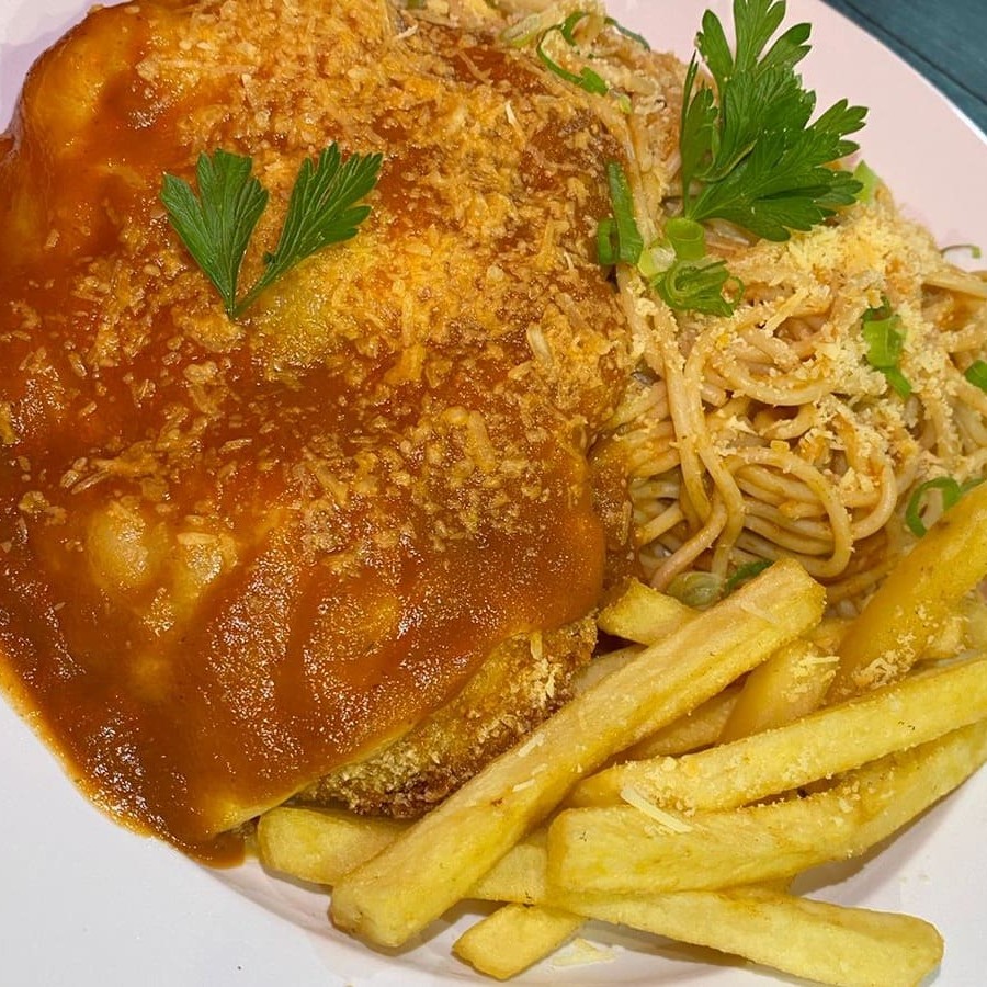 Experimente nosso delicioso empanado de frango com molho de tomate caseiro, perfeitamente finalizado com queijo derretido e uma porção de fritas crocantes. Uma combinação irresistível para satisfazer os seus desejos!